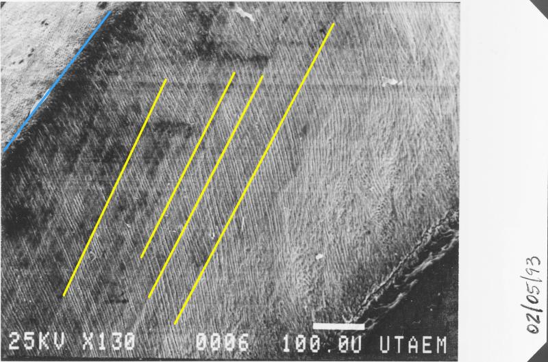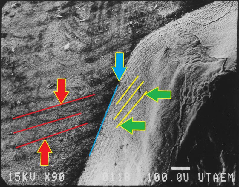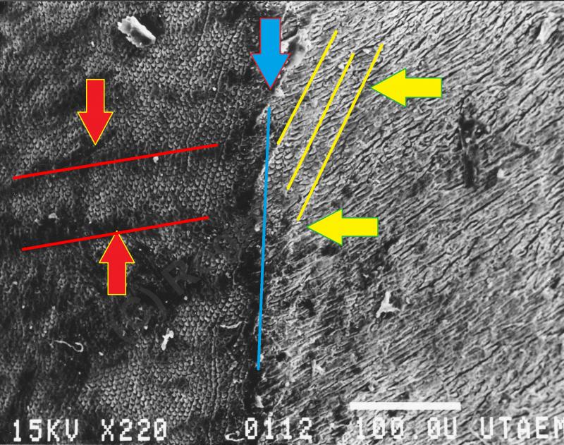 Above: 90x view. The blue arrow points to the fracture line where the external surface of the enamel (L) intersects with the interior of the tooth (R) in sagittal section. The yellow lines indicate the Striae of Retzius.