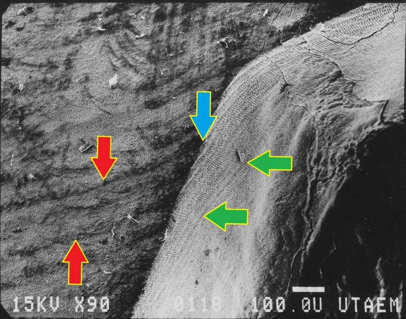 Above: a 90x view of a tooth. The red arrows point to the wavy lines on the external enamel surface which are the Perikymata.