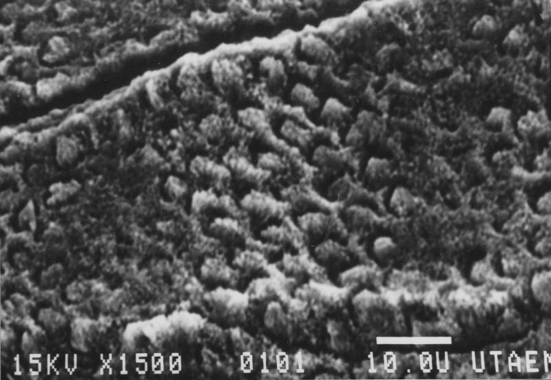Below: etched enamel surface, if you ever wanted to see human enamel prisms, 1500x.
