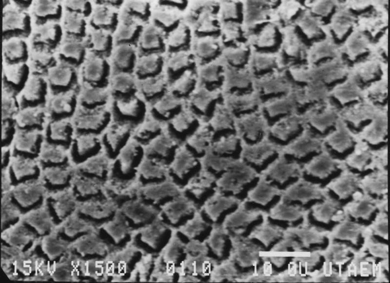 Initially I arbitrarily selected extracted human incisors, froze them in liquid nitrogen, and carefully fractured them with a surgical mallet. Eventually I found that just smacking them at room temperature with a regular carpenter's hammer worked just as well. I would try to obtain a fracture that ran lengthwise nominally parallel to the long axis of the tooth in the sagittal plane. I then dipped the crown of the tooth in 30% HCl for about 3-5 sec and rinsed with water. The tooth was next air-dried and sputter coated with platinum/palladium in argon and the selected "corner" was examined in the S.E.M.